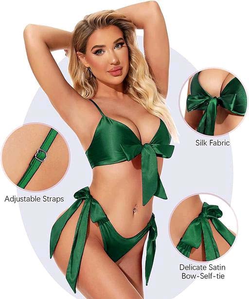 Women Hot & Sexy Lingerie Set Soft Satin fabric Lace Nightwear Bow Tie Bra and Panty Sets Free Size Green Colour :green